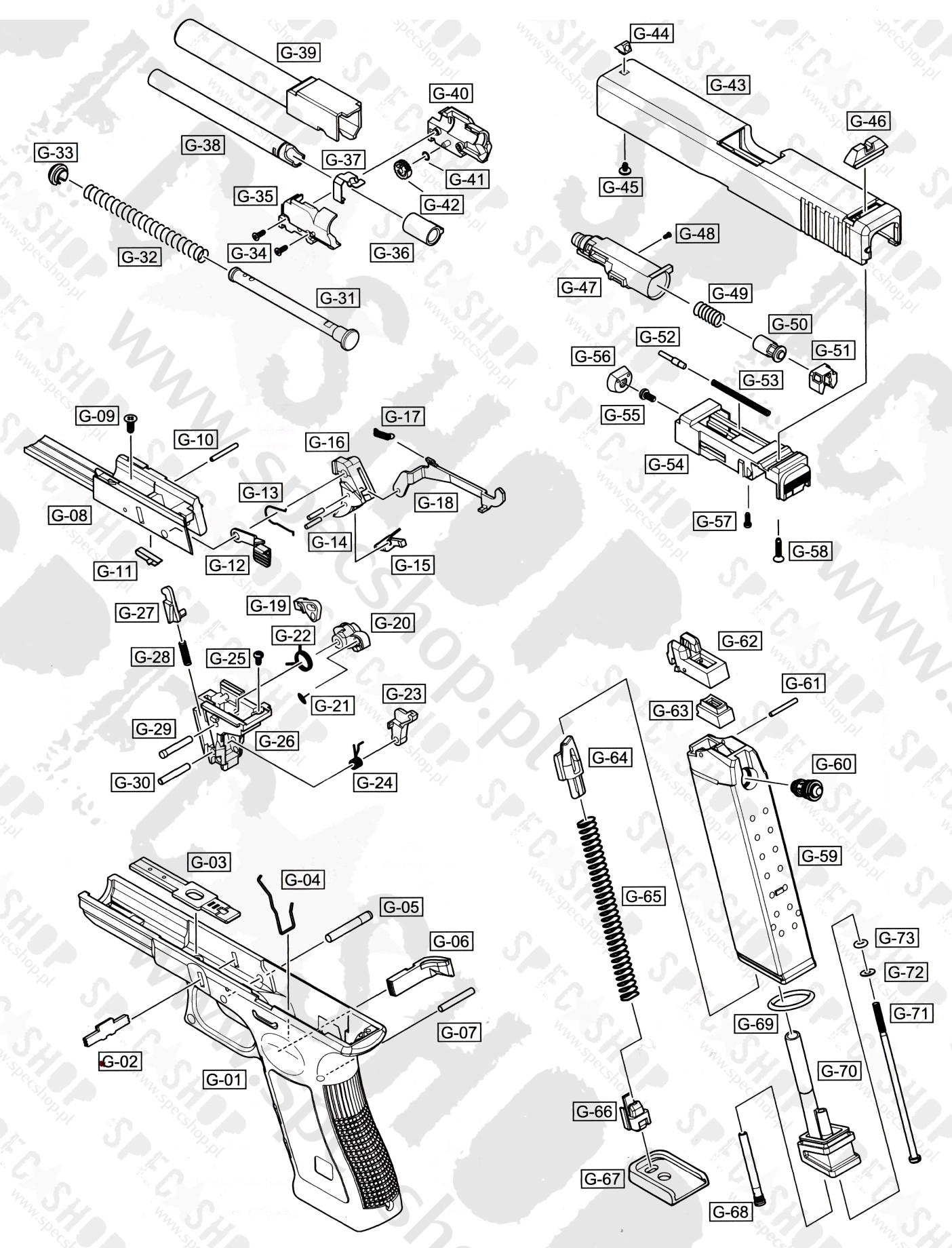 2. Exploded Schematic of a Glock Pistol with Parts List 4 3. Glock Field Strip Disassembly 5-8 4. Cleaning the Field Stripped Firearm 9 5. Lubrication Points 10 6. Slide Disassembly and Firing Pin Replacement 11-14 7. Firing Pin Safety Check 15 8. Glock Receiver Disassembly 16-19 9. Find parts for a Glock Pistol in this easy-to-understand schematic. These gun diagrams will help you better understand how your firearm is assembled with links to the gun parts for easy check out. Glock 17 Glock 19 Glock 20 Glock 21 Glock 22 Glock 23 Glock 24 Glock 25 Glock 26 Glock 27 Glock 28 Glock 29 Glock 30 Glock 31 Glock 32 Glock 33 Glock ... GLOCK Factory Magazine Gen 4 GLOCK 17, 19, 26, 34 9mm Luger 33 Round Polymer Black ... Ammo and Gun Collector: Glock Internal Parts Diagrams Emergency ...