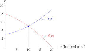 Demand: P=10-0.2Qd. Supply: P=2+0.2Qs. Putting the supply and demand curves from the previous sections together. These two curves will intersect at Price = $6, and Quantity = 20. In this market, the equilibrium price is $6 per unit, and equilibrium quantity is 20 units. At this price level, market is in equilibrium.