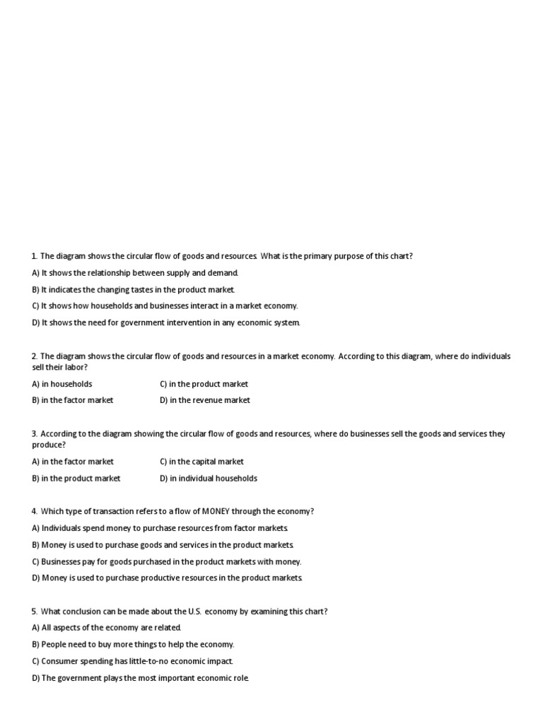 According to the diagram showing the circular flow of goods and resources, where do businesses sell the goods and services they produce? B) in the product market. What conclusion can be made about the U.S. economy by examining this chart? A) All aspects of the economy are related.