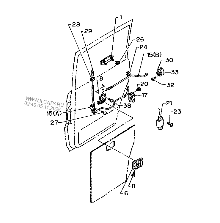 Diagram of OEM DOOR HARDWARE/REAR. ... HINGE KIT,R/D UPR(INCLS DOOR & BODY SIDE) - LH. Required: 01 ... Hood Latch Striker Plate Bolt. Horn Mount Bolt.