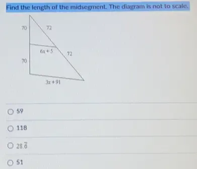 Find the Length Of the Midsegment the Diagram is Not to Scale. with attachment 1 find the length of the midsegment the find the length of the midsegment the diagram is not to scale 1 point 80 30 40 26 length of midsegment = 6x 4 = 6 6 find the length of the mid segment the diagram is not to scale find the length of the mid segment the diagram is not to scale.