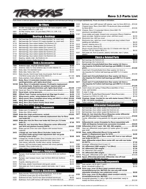 Revo 3.3 rebuild instruction manual Traxxas REVO 3.3 Transmission & Gearing Parts How to rebuild a traxxas 3.3 engine The Traxxas 3.3 engine for radio-controlled vehicles offers the torque necessary for spinning the big monster-truck wheels of the T-Maxx, S-Maxx, or Revo, while also providing the thrust power required by the high-speed Jato 3.3.