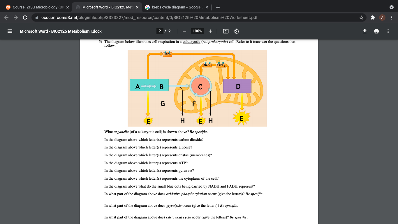 37 using the diagram below, select the area of the cell where the krebs cycle occurs.