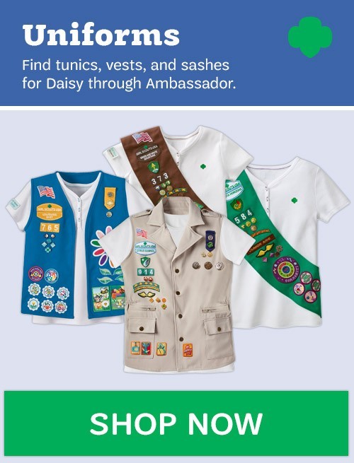 Girl Scouts from each grade level have one official uniform item (a sash, vest, or tunic) to display badges, pins, awards, and other insignia. This item is required when you participate in ceremonies or officially represent Girl Scouts.
