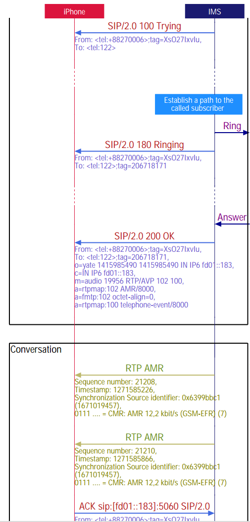 VoLTE uses IMS SIP signaling to set up voice calls. The following VoLTE call flow describes the IMS call setup and release. An example of sending an SMS over IMS is also included. Sample RTP and ...