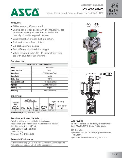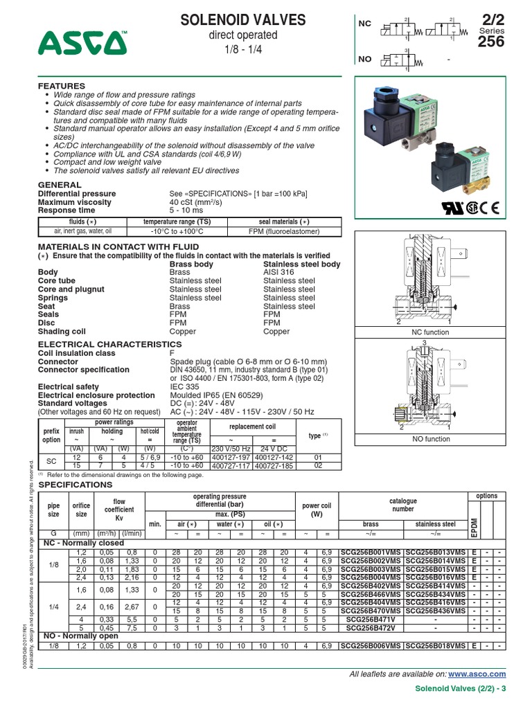 ASCO Valves. EASCO Valve, Inc.R 50 ... ASCOr solenoid valves with design change letter “G” or ... lead wires and 1/2I conduit connection is designed to meet.6 pages Asco Solenoid Valve 8262 Wiring Diagram. Quarter-turn manual operator with screw slot (suffix MS). Panel mount (prefix GP for conduit; consult ASCO for other electrical connections). Vacuum service. Aug 22, 2018 · 22.08.2018. 22.08.2018. 4 Comments. on Asco Redhat 2 Wiring Diagram. 4-Way/2 and 3 Position Valves. Four-ported Solenoid valves are supplied, as listed, with either RedHat II molded 4 and 5-Ported Valves Flow Diagrams. 2-W. A. Y. 1. 2-Way/2 Position Valves. Two-way solenoid valves have one inlet and one outlet, Solenoid valves are supplied, as listed, with either RedHat II.