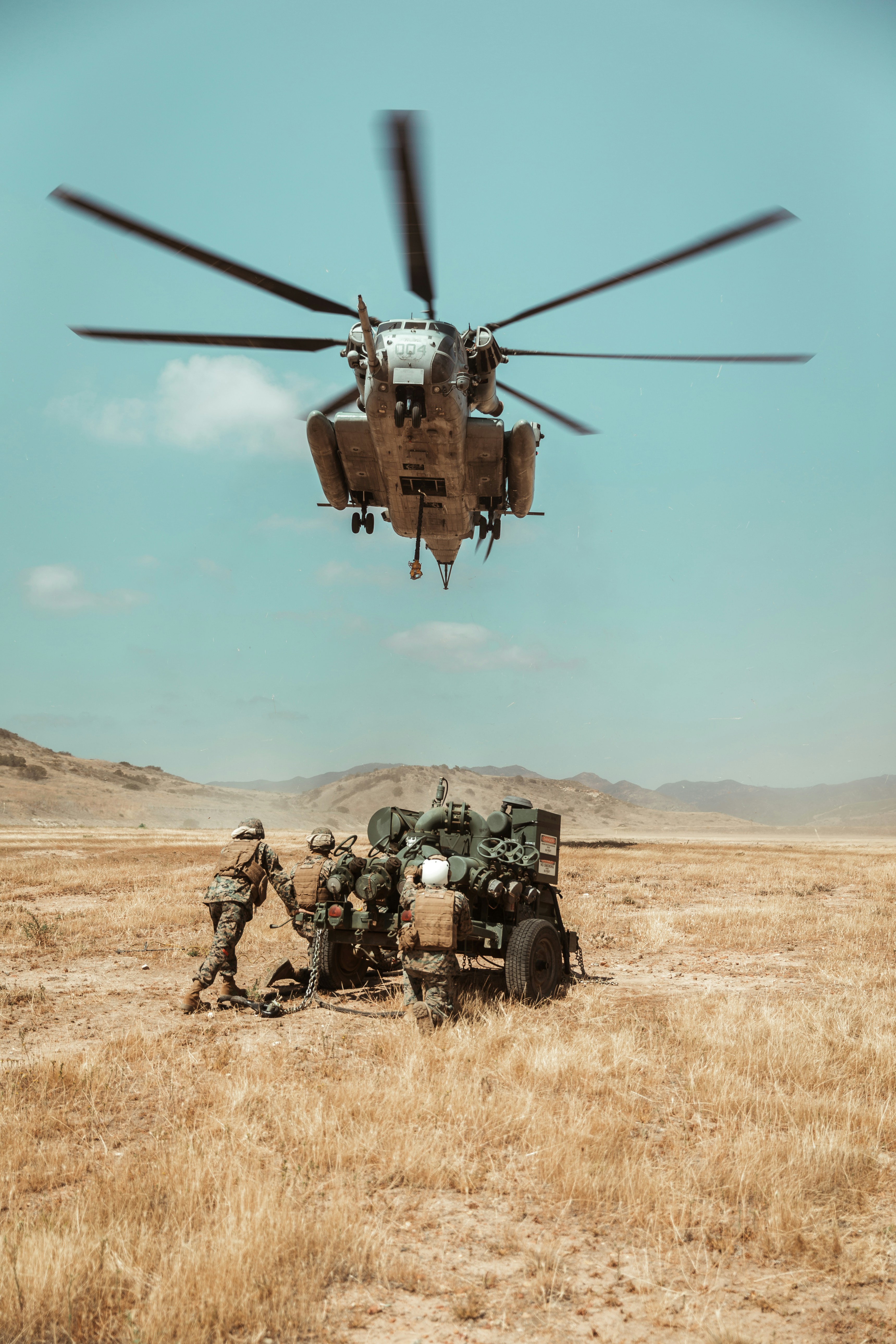 U.S. Marines with Beach and Terminal Operations Company, 1st Landing Support Battalion, 1st Marine Logistics Group, I Marine Expeditionary Force, conduct an external lift of a bulk fuel pump with U.S. Marine Heavy Helicopter Squadron (HMH) 361, Marine Aircraft Group 16, 3rd Marine Aircraft Wing, on Camp Pendleton, California, May 18, 2021.