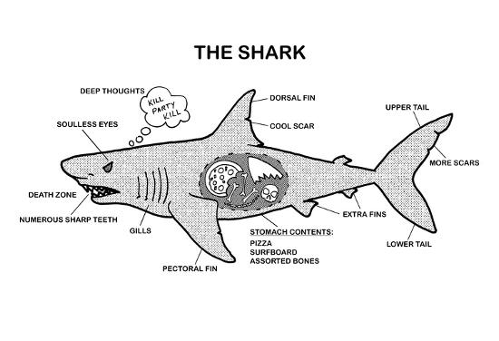 External Anatomy of the Dogfish Shark; Examine the side view photographs of the spiny dogfish shark by clicking the blue lettered links in the column to the right. The shark has a graceful and streamlined body shape built for fast, long distance swimming. The body is divided into the head, trunk, and tail.