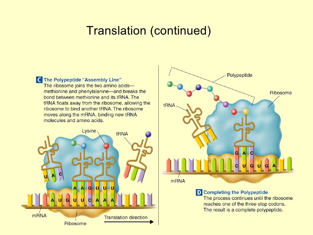 A book or movie has three basic parts: a beginning, middle, and end. Translation has pretty much the same three parts, but they have fancier names: initiation, elongation, and termination. Initiation ("beginning"): in this stage, the ribosome gets together with the mRNA and the first tRNA so translation can begin.