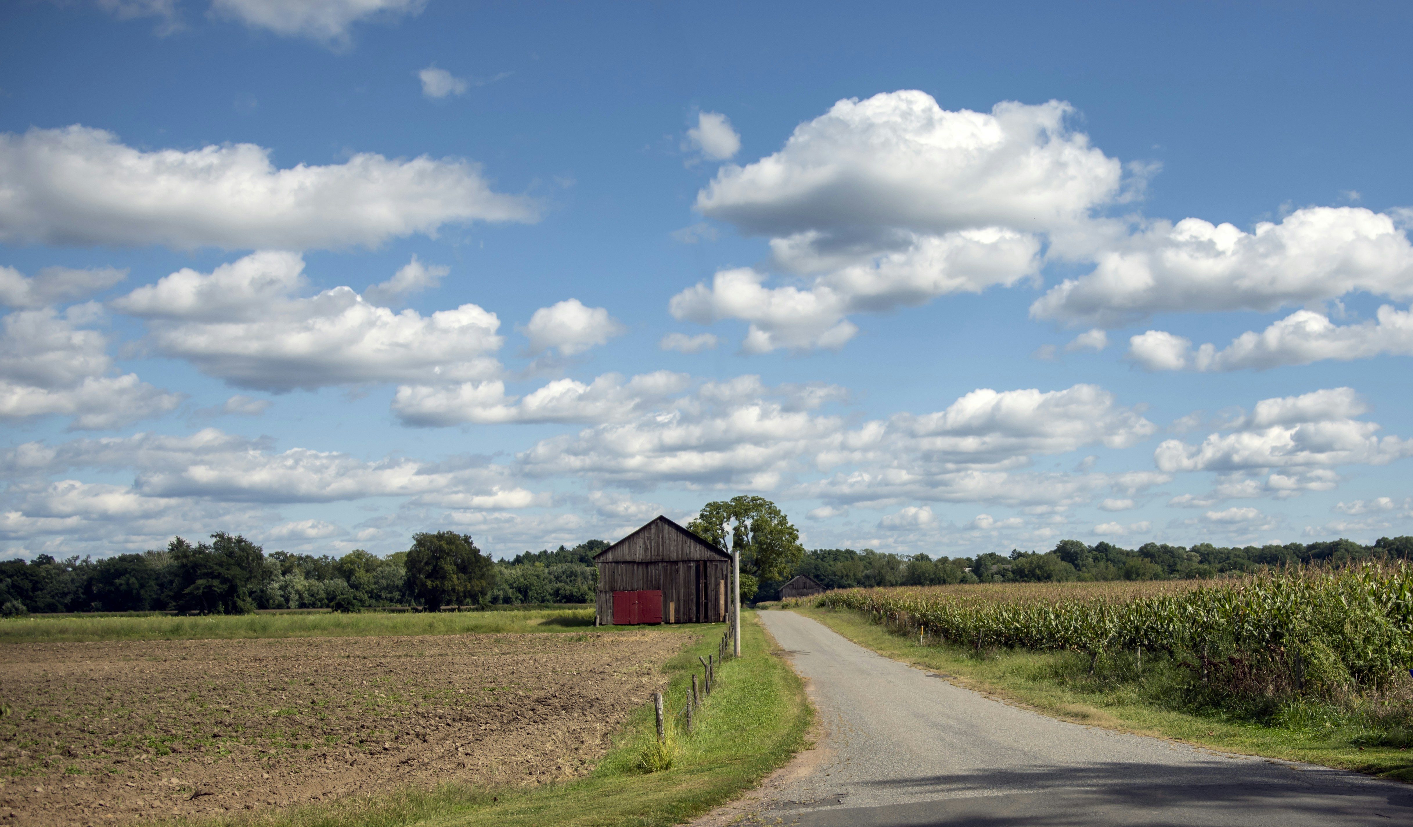Red doors stand out on tobacco shed on a late Summer afternoon on tobacco farm in central Connecticut Valley (South Windsor).
