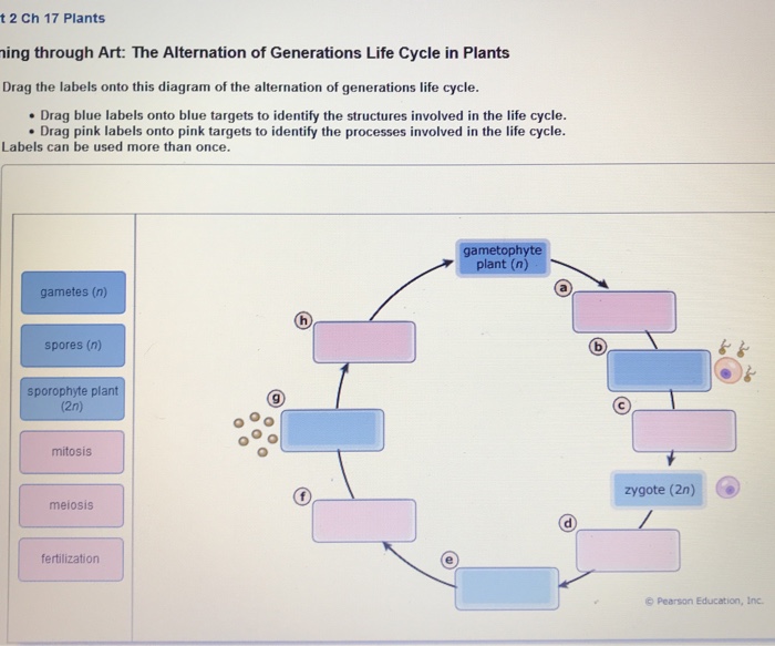 alternation of generations peroxisome enzymes that minimize losses from photorespiration the development of sporopollenin to prevent the desiccation of zygotes ... Label the structures on this diagram of a moss. Drag the labels onto the diagram below. Not all labels will be used. a. sporophyte b. seta c. sporangium d. foot e. gametophyte Alternation of Generations in ferns Therefore, a true alternation of generations is always between a diploid asexual and haploid sexual generations, as is exhibited by fern plant. But, in Obelia the condition is somewhat different and, therefore, objections were raised to use the term alternation of generations for it. Label the diagram below, paying particular attention to the events occurring when there is a change from n to 2n and from 2n to n. Use the following words: ... required for some production in the alternation of generations life cycle. Ch. 12 If the common oat plant (Avena sativa L.) is hexaploid, its gametophyte generation is A) 6x B) 2x C) 3x ...