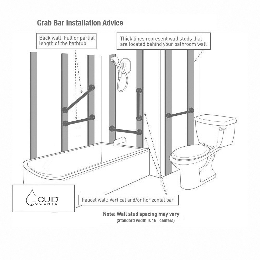 Horizontal grab bars mounted inside the tub or shower provide added stability, whereas diagonal grab bars provide added stability when lowering to sit on a shower seat. Generally a 16-in grab bar or a grab bar that is a multiple of 16 (16-in, 32-in, or 48-in) works best. In most cases studs are located 16 inches apart on center.