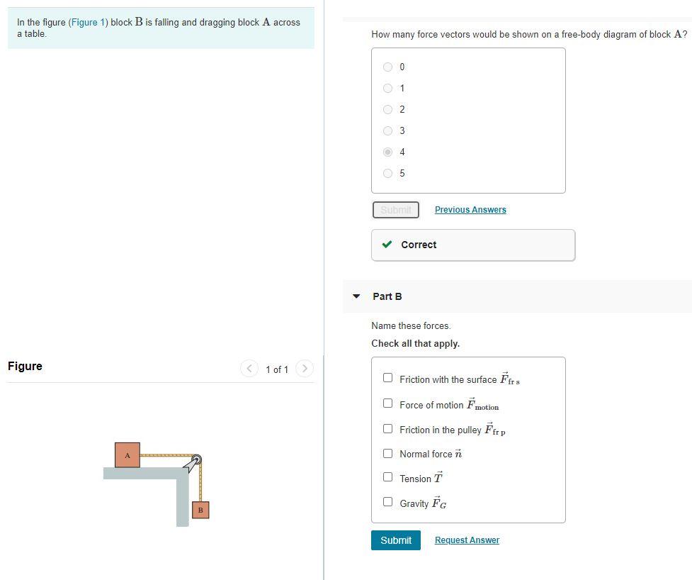 How many force vectors would be shown on a free-body diagram of block A? 02 3 05 Submit Previous Answers Correct Part B Name these forces Check all that apply.1 answer · Top answer: Answer 1) 4 forces An...