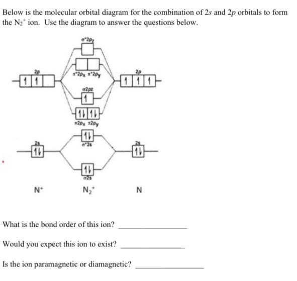 please draw the molecular orbital diagram mo diagram of n2 ... N 2+ ion is formed by the loss of one electron from N 2 molecule. This electron will be lost from σ (2p z) orbital. Hence, the electronic configuration of N 2+ ion will be N 2 + = KK [σ (2s)] 2 [σ* (2s)] 2 [π (2p x )] 2 [π (2p y )] 2 [σ (2p z )] 1 Here, N b =7, N a =2 so that Bond order = 1/2 (7-2) = 5/2 = 2.5