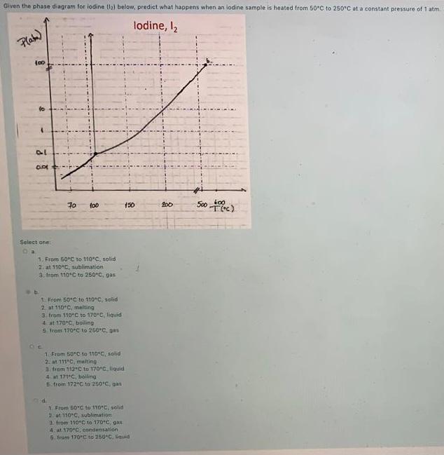Answered: Below is the phase diagram for iodine.… | bartleby Science Chemistry Q&A Library Below is the phase diagram for iodine. If you start with a sample of iodine at 150°C and 1.0 atm and you increase the temperature, what phase change will you observe? a. boiling b. melting c. sublimation d. melting, then boiling.