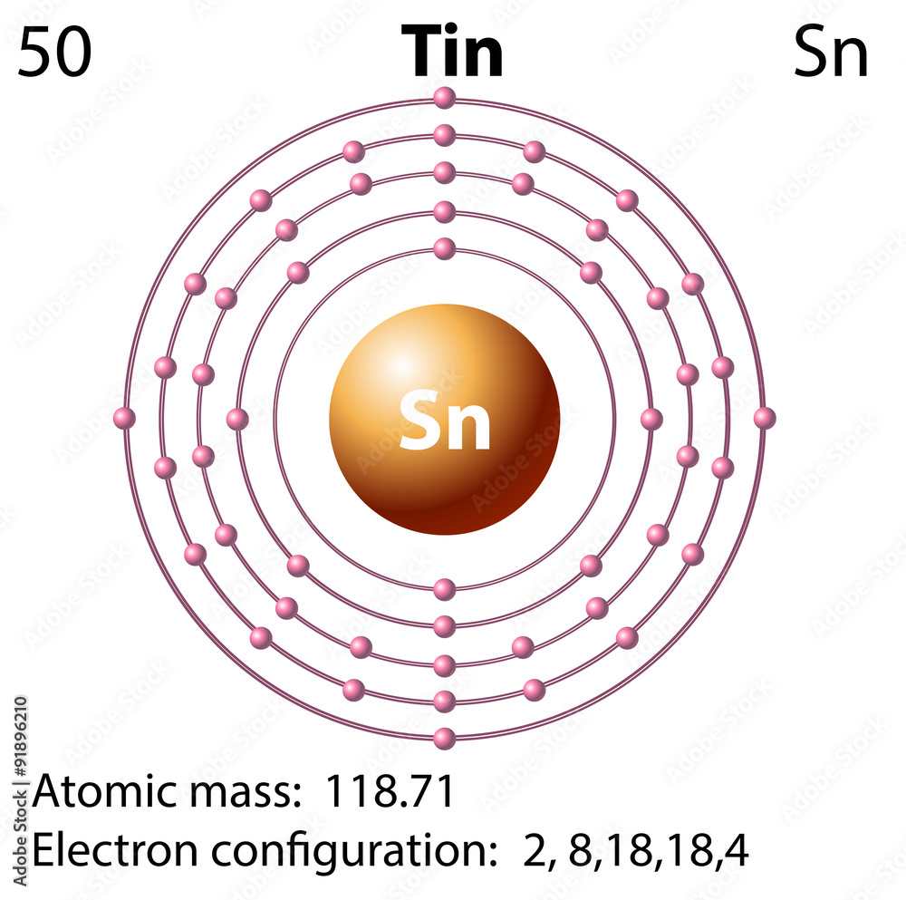 WebElements Periodic Table » Tin » properties of free atoms Binary compounds. Compound properties. Element reactions. Tin atoms have 50 electrons and the shell structure is 2.8.18.18.4. The ground state electron configuration of ground state gaseous neutral tin is [ Kr ]. 4d10. 5s2. 5p2 and the term symbol is 3P0. Schematic electronic configuration of tin. The Kossel shell structure of tin.