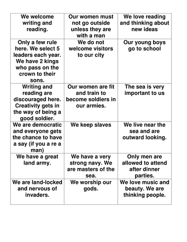 Athens vs Sparta - Difference and Comparison | Diffen Both Athens and Sparta hold historic value for Greece and the world. Athens is the capital and the largest city of Greece. In medieval times, the city of Sparta was destroyed by many invasions. Modern day Sparta, which is known as Sparti in Greece, was rebuilt around 1834. Ancient Greece UNIT for Teachers The growth of Athens and Sparta and the Persian Wars. 3. This unit will concentrate on geographic and language arts skills. 4. The Unit will focus on On blank overhead draw a Venn Diagram. Label one section Sparta, label the other outside section Athens, label middle shared section similarities.