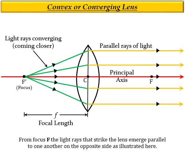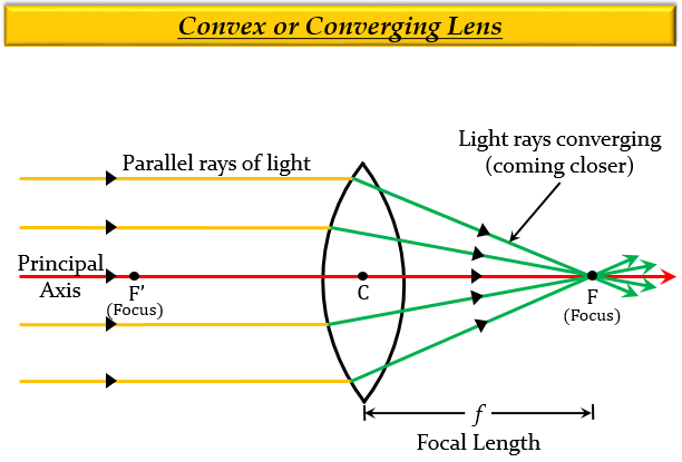 Image Formation by Lenses | Physics | Converging or Convex Lens The lens in which light rays that enter it parallel to its axis cross one another at a single point on the opposite side with a converging effect is The distance from the center of the lens to its focal point is called focal length f. Figure 2. Sunlight focused by a converging magnifying glass can burn paper.