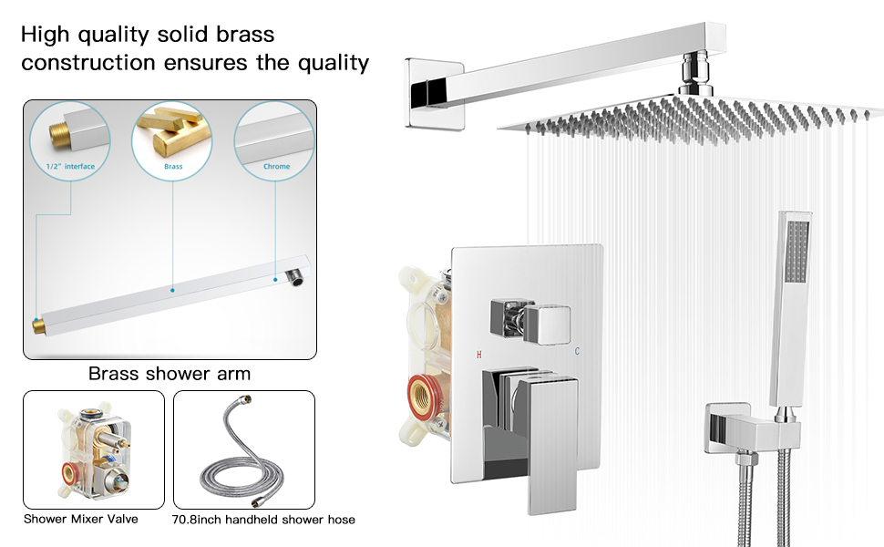 BWE 10 Inch Square Bathroom Luxury Rain Mixer Shower Combo Set Wall Mounted Shower Kit Rainfall Shower Head System Polished Chrome Shower Faucet ...